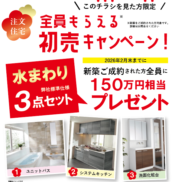 初売りキャンペーン! チラシを見た方限定 2026年2月末までに新築ご成約された方全員に弊社標準仕様「水まわり3点セット」プレゼント中です!ユニットバス システムキッチン 洗面化粧台が無料になるチャンスですこの機会に是